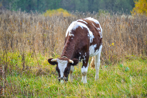 Cow grazes in a meadow. Autumn landscape. Russia