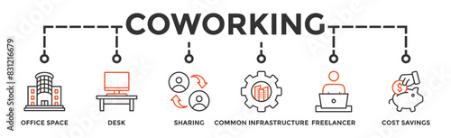 Coworking banner web icon vector illustration concept with icon of office space, desk, sharing, common infrastructure, freelancer, and cost savings