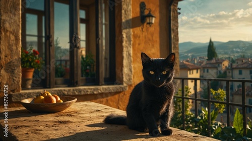 cozy balcony with relaxing black kitten with view of a lovely Tuscan village at sunny evening