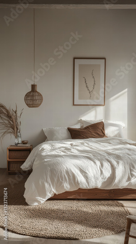 Cozy Bedroom: The sunlight streams into a bedroom, illuminating the bed's inviting linens and creating a warm and serene atmosphere. The image whispers of restful nights and tranquil mornings.