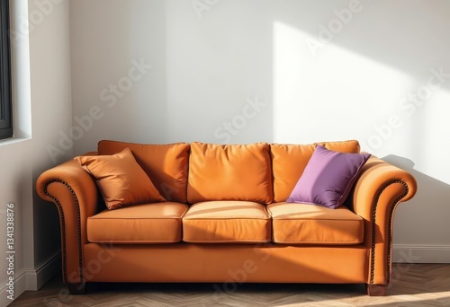 Cozy brown sofa with three pillows in a relaxed corner setting, fall, texture