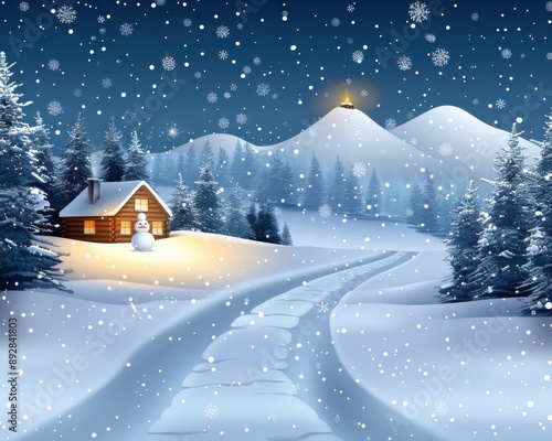 Cozy Cabin in a Snowy Mountain Landscape at Night with Fresh Snowfall, Illuminated Trees, and Serene Winter Atmosphere