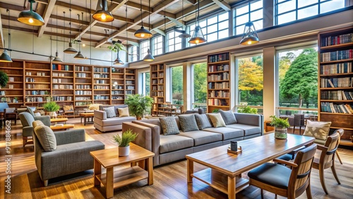 Cozy campus bookstore filled with rows of textbooks, notebooks, and school supplies, surrounded by comfortable seating areas and warm natural light.