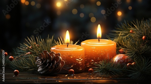 Cozy Christmas card. Burning candles in the branches of a fir tree.