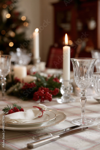 cozy christmas dinner setting with soft candlelight illuminating table