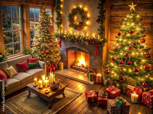 Cozy Christmas Fireplace Drone Aerial View: Decorated Trees, Gifts, Festive Winter Scene