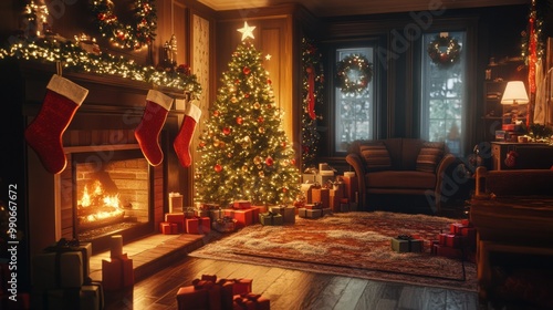 Cozy Christmas living room with a glowing tree, stockings, and a festive fireplace mantel.