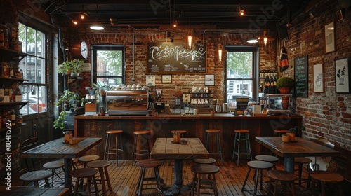 Cozy Coffee Shop Ambiance with Rustic Decor and Warm Lighting, Stock Photo Illustration with Copy Space