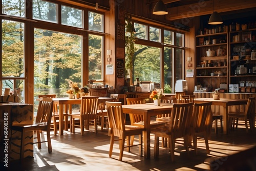 Cozy Dining Experience with Rustic Wooden Tables and Chairs in a Charming Restaurant Setting Generative AI