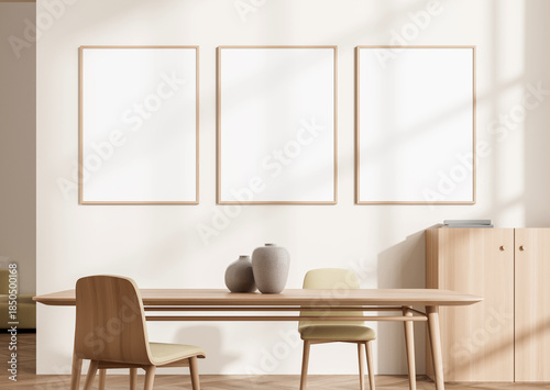 Cozy dining room interior with three blank wooden frame posters on light beige wall, minimal furniture, wooden table and soft natural lighting. 3D Rendering