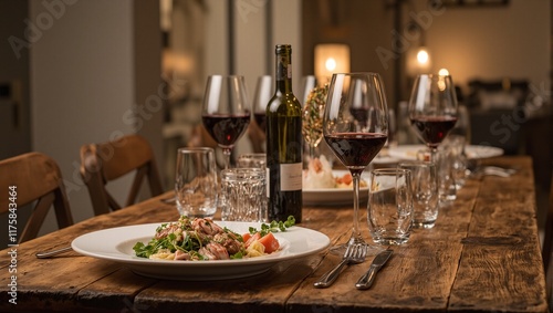 Cozy dining room with gourmet meal wine glasses and candlelight