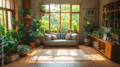 Cozy Eco-Friendly Home Interior with Wooden Furniture, Indoor Plants, and Natural Light, Featuring a Family Engaging in Sustainable Practices like Recycling