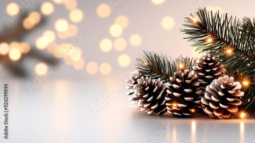 Cozy holiday background featuring Christmas tree branches, small pine cones, and twinkling string lights against a gradient blur, perfect for text overlay