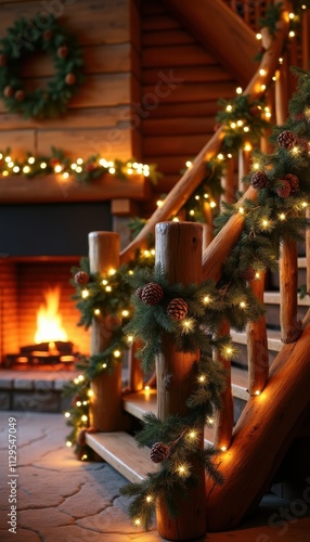 Cozy holiday cabin interior with a beautifully decorated staircase. Warm lights, garlands, and a fireplace create a festive atmosphere perfect for Christmas.