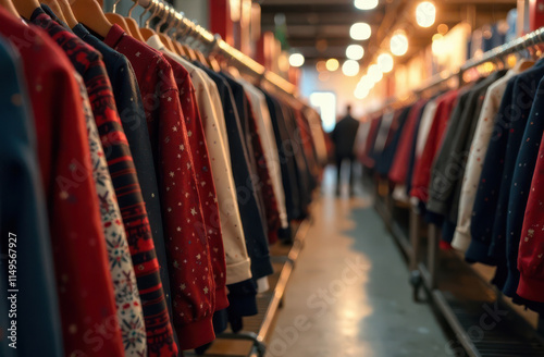 Cozy holiday sweaters on display in fashionable clothing store aisle