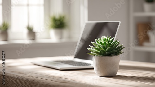 Cozy home office scene. Laptop, succulent, and sunlight