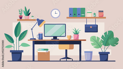 Cozy Home Office Workspace with Laptop and Indoor Plants Illustration