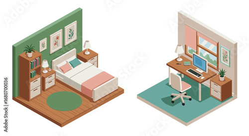 Cozy isometric room design: bedroom and home office inspiration