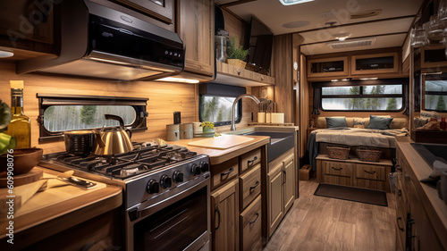 cozy kitchen interior in the trailer of mobile home or recreational vehicle. Generative Ai