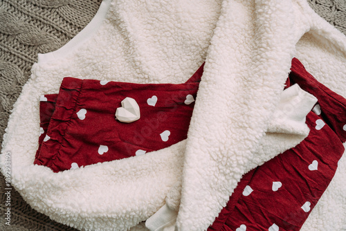 Cozy knit sweater and red pajama pants with heart pattern on soft blanket with sliced oranges, top view