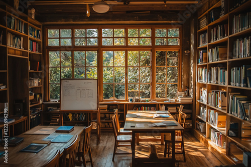 Cozy library interior with wooden furniture, sunlight streaming through large windows, peaceful atmosphere
