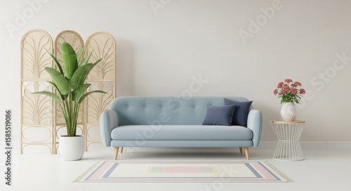 Cozy living room featuring a light blue sofa, decorative plants, and a stylish side table with flowers