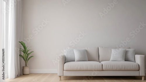 Cozy living room with a light-colored sofa and a potted plant near a window during daytime