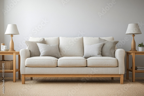 Cozy living room with a light-colored sofa and wooden side tables in a sunlit space