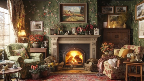 Cozy Living Room with a Vintage Touch Featuring a Fireplace, Beautiful Floral Wallpaper, Elegant Furniture, and Warm Lighting in a Homey Environment
