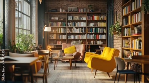 Cozy living room with bookshelves and yellow chairs.