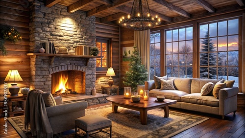 Cozy living room with crackling fireplace lit on a cold winter evening, warm golden lighting illuminates comfortable furnishings and rustic wooden decorations in a welcoming atmosphere.