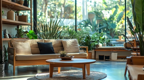 Cozy living room with natural light and greenery. Wooden furniture, plush seating, and a round coffee table