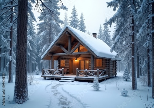 Cozy log cabin in a snowy forest landscape during winter twilight