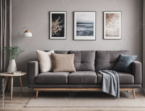 Cozy Modern Living Room With Stylish Gray Sofa and Minimalist Artwork on Walls