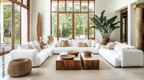 Cozy modern living room with white sofas, wooden coffee tables, rattan decor, potted plants, and expansive windows letting in bright natural light