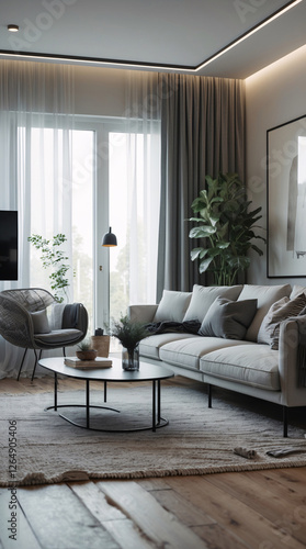 Cozy neutral Scandinavian living room design with a gray couch emphasizing minimalist design for a simple yet inviting atmosphere Modern Interior Design Inspiration