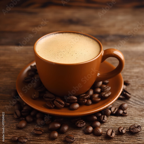 Cozy Orange Coffee Cup with Coffee Beans on Rustic Wooden Table