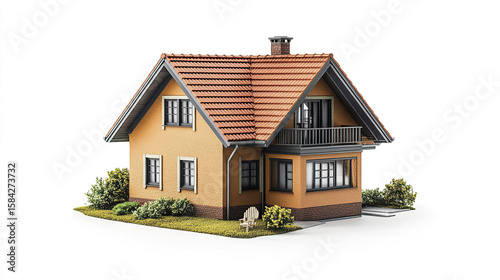 Cozy orange house with red tile roof and balcony surrounded by green bushes and grass on white background, peaceful suburban home with outdoor chair and chimney