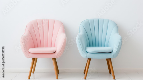 Cozy pastel chairs in minimalist setting create serene atmosphere, perfect for relaxation and style. pink and blue hues add playful touch to any room