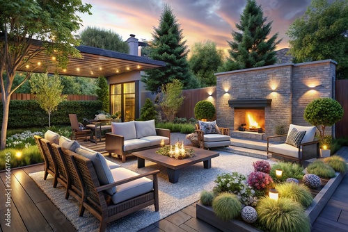 Cozy Patio with Fireplace and Solar Panels for Outdoor Living, Backyard Oasis, Garden Retreat with Comfortable Seating and Stylish Furniture