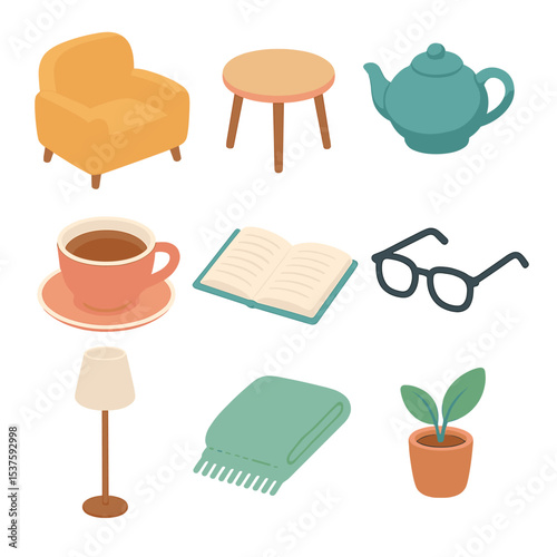 Cozy Reading Nook Icons. Isometric Flat icon set of cozy reading nook reflections: armchair, side table, teapot, cup of tea, open
