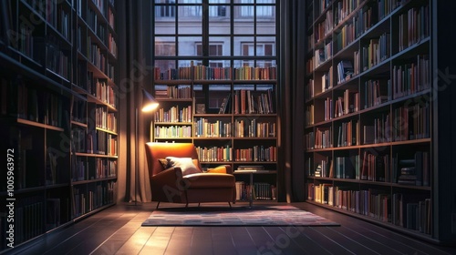 Cozy reading nook with bookshelves and a comfortable chair illuminated by a lamp.