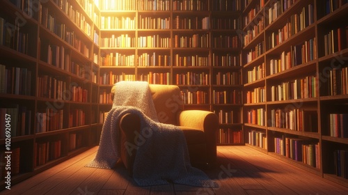 Cozy Reading Nook with Plush Armchair Surrounded by Colorful Novels and Warm Ambient Lighting, Ultra-Detailed, Cinematic Light