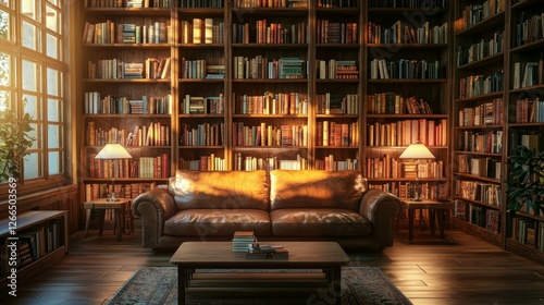 Cozy reading nook with warm sunlight and wooden bookshelf interior