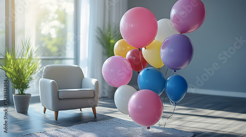 Cozy room with an armchair plant and vibrant bunch of colorful balloons floating on a rug