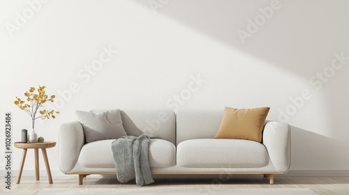 Cozy Scandi living room with a light grey sofa, wooden side table, and a soft throw blanket