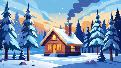 Cozy Snowy Cabin Vector with Pine Trees & Chimney Smoke