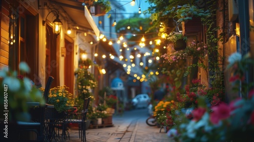 Cozy street scene with potted flowers and festive lights at dusk