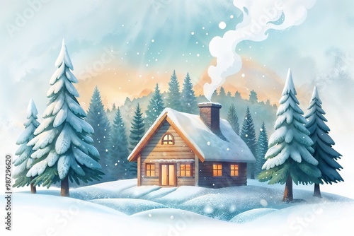 Cozy winter cabin with warm glow nestled in snowy forest against twilight sky