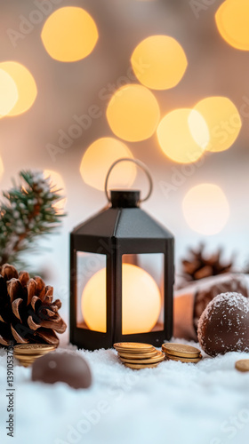 Cozy winter scene with festive lantern, pine cones, and chocolate in snowy setting